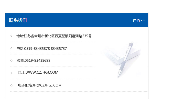 地址:常州市新北區(qū)友邦商務(wù)大廈1幢16、17層  電話:0519-85101652  傳真:0519-85112595  郵編:213022  網(wǎng)址:www_cz-jiayue_cn.077939.com  郵箱:xiajifengaa@163.com